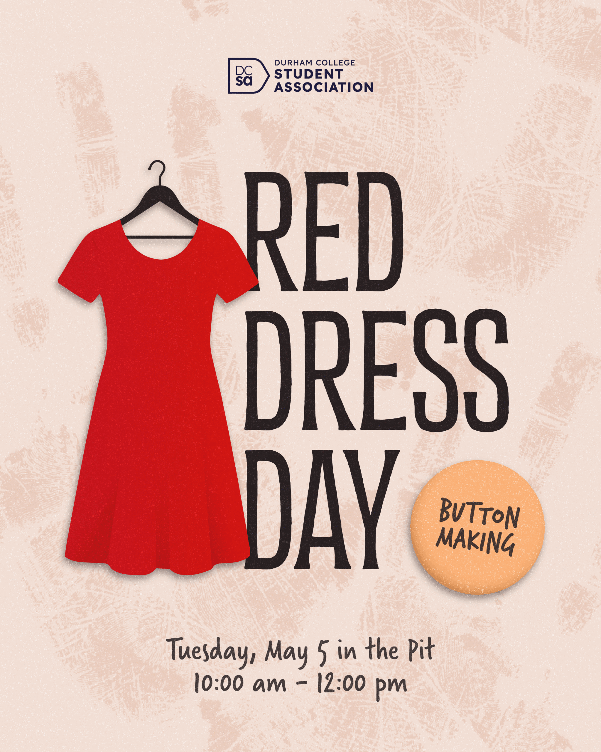 In recognition of Red Dress Day, the Durham College Student Association (DCSA) invites the campus community to join us for a meaningful drop-in button-making session. Red Dress Day, observed annually