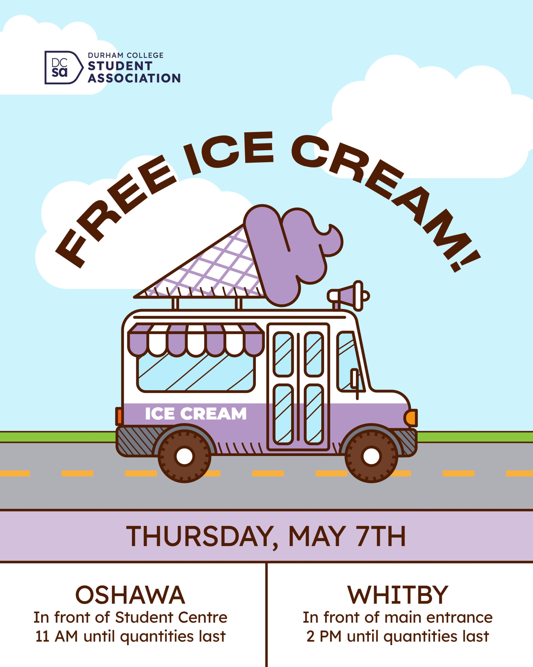 Watch out for the ice cream truck pulling into both campuses, giving away Free ice cream with DCSA! Whitby Campus When: May 7th Where: Out front of the Don Lovisa building When: 11:00 am - 12:30 pm Oshawa Campus When: May 7th Where: outside the Student Centre When: 2:00 pm - 3:30 pm